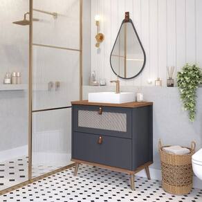 CARACTERÍSTICAS ARMÁRIO: - Gabinete para Banheiro com Cuba desenvolvido em MDF - Porta em MDF revestido com tela sintética de fácil limpeza e antimofo - Acabamento em pintura BP. - Cuba em mármore sintético. - Amplo espaço interno - Porta com pistão à gás - Puxadores de estilo retrô em couro sintético.