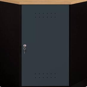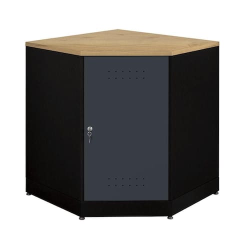 Armário de canto em aço com tampo em madeira 400, que encaixa nos cantos para melhor aproveitamento de espaço. Compõe a Presto Ábile, linha de Organizadores Modulares da Presto Sistemas de Organização, componíveis entre si, que podem ser configurados de maneira flexível e versátil, possibilitando diversas combinações.