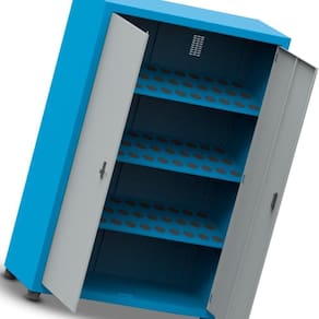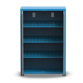 O Armário Porta Cone ISO30 para 108 peças com 3 prateleiras possui pés niveladores e detém uma capacidade de 50kg por prateleira.