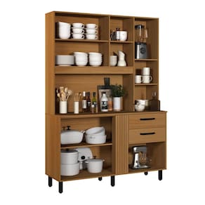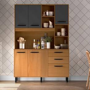 Na parte superior, o armário oferece compartimentos abertos e fechados, perfeitos para expor itens decorativos, organizar louças ou manter o dia a dia mais prático. Os puxadores em destaque garantem um toque contemporâneo, enquanto os pés elevados facilitam a limpeza do ambiente.