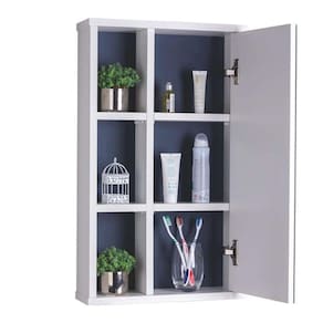 Suas medidas totais são: 70cm de Altura x 42cm de Largura x 13cm de Profundidade. Nichos Internos: 20cm de Altura x 22,5cm de Largura x 13cm de Profundidade. Nichos Externos: 20cm de Altura x 14cm de Largura x 13cm de Profundidade. O espelho mede: 66cm de Altura x 26cm de Largura. Peso: 8,5kg.