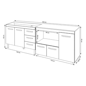 Características do Kit Montado: Largura Total: 232 cm (lado a lado dos dois balcões) Profundidade: 50 cm Altura Total: 85,5 cm (com tampo do balcão para micro-ondas e forno)