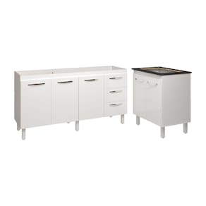 Armário Cozinha Balcão Gabinete De Pia 160 Cm Estela E Balcão Fran Para Fogão Cooktop 4 Bocas Branco Descubra o Kit Balcão de Pia 160 cm + Balcão para Cooktop 4 Bocas, a escolha perfeita para renovar sua cozinha com estilo e funcionalidade. O balcão de pia oferece 3 portas e 3 gavetas, proporcionando amplo espaço para organizar seus utensílios de maneira prática. Já o balcão para cooktop conta com duas portas, ideal para otimizar o espaço e facilitar o seu dia a dia. Feitos em MDP com acabamento elegante, os puxadores cromados e os pés reguláveis garantem durabilidade e fácil nivelamento. Sua cozinha mais organizada, moderna e prática!