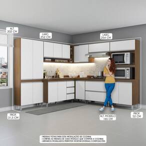 Armário Cozinha Canto Balcão Paneleira Sabrina Menu Móveis Branco A Cozinha Sabrina Modulada foi desenvolvida para atender todas as suas necessidades do dia a dia com um design moderno, funcionalidade e versatilidade. A Cozinha Modulada e a tendencia do momento e foi arquitetada com modulos uteis que vao facilitar a sua rotina diaria, preparos dos alimentos e armazenamento dos utensilios e mantimentos, mantendo sua cozinha sempre organizada. Por se tratar de armarios de cozinha modulados voce pode ajustar os modulos conforme o espaco disponivel e montar diversas modulacoes diferentes para deixar o ambiente muito mais aconchegante. A elegancia fica por conta dos puxadores em perfil e os pes dando um toque unico de sofisticacao. A Cozinha Sabrina e produzida com materiais de excelente qualidade, garantindo a durabilidade e vida util. O melhor em moveis no design atual aliando conforto, qualidade e otimos precos, so na Menu Moveis! Caracteristicas: Produzida em MDP de 15 mm Acabamento UV Portas com Dobradica Metalica Porta Basculante com Pistao a Gas Gavetas com Corredica Telescopica Puxadores Perfil em ABS Pes com Regulagem em ABS Balcao para Cooktop possui Tampo com Ranhura que pode ser utilizado com cooktop de 5 bocas, caso nao cortar pode utilizar normalmente. NAO acompanha TAMPO e PIA