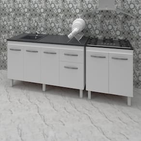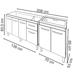Kit Balcão Para Pia de 140 cm Camile com Balcão para Cooktop Jade 5 bocas: Perfeito para tornar a sua cozinha ainda mais atraente e elegante. Desenvolvido com material de alta qualidade, pintura UV, acabamento perfeito nos detalhes, este kit é o que estava faltando para tornar a sua cozinha o seu cantinho ainda mais especial! Adquira Já o seu! Características Balcão de Pia Camile 138 cm:Altura:83,5 cm (Com os Pés).Altura sem os pés: 67 cm.Largura: 138 cm (Padrão para pia de 140 cm).Profundidade: 50 cm.Material: MDP (madeira).Portas: 4 Portas.Gavetas: 1 Gaveta.Prateleiras: 1 Prateleira.Puxadores: 6 puxadores plásticos cromadosPés: 6 pés reguláveis de plástico.Altura dos pés:16,5 cmRegulagem dos pés: Somente para nivelamento, (Chega no máximo a 18 cm).Corrediças: Metálicas.Indicações de Uso: Cozinha Acompanha tampo: Não Características Balcão Para Cooktop Jade 5 Bocas:Altura: 85 cm (Altura do produto com os pés e com o tampo)Altura sem os pés: 68,5 cmLargura: 70 cmProfundidade: 53 cm*A largura 70 cm e Profundidade 53 cm correspondem ao tampo do balcão, sem o tampo o balcão tem 68 cm de Largura e 50 cm de profundidade (mesma profundidade do balcão de pia).Dimensões do Nicho (Recorte para encaixar o cooktop): 64 x 35,5 cmMaterial: MDP Portas: 2 PortasPrateleiras: 1 prateleira (Opcional)Puxadores: 2 puxadores plásticos cromadosPés: 4 pés reguláveis de plástico.Altura dos pés: 16,5 cmRegulagem dos pés: Somente para nivelamento, (Chega no máximo a 18 cm).Acompanha tampo: Sim Características do kit montado: Largura 208 cm (lado a lado os dois balcões). Profundidade 53 cm (Profundidade do balcão para cooktop com tampo, sem tampo os balcões possuem 50 cm de profundidade.) Altura: 85 cm (Altura do balcão para cooktop com tampo, sem tampo os balcões possuem 83,5 cm de altura.) *Os Móveis não são acoplados, são montados individualmente e podem ser ultilizados em locais diferentes. *Imagem meramente ilustrativa, não acompanha objetos decorativos, é somente os dois balcões.