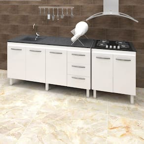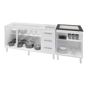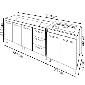 O Kit Balcão para pia de 150 cm Diana com Balcão para Cooktop 4 Bocas Jade vai trazer para a sua casa praticidade, elegância e tornar a sua cozinha um ambiente ainda mais especial. Por serem móveis da mesma linha, eles combinam, deixam o hambiente harmônico, diferenciado e ainda mais atraente! A sua cozinha merece este lindo kit da Moblis Móveis, adquira já o seu! Características:Altura:83,5 cm (Com os Pés).Altura sem os pés: 67 cm.Largura: 148 cm (Padrão para pia de 150 cm).Profundidade: 50 cm.Material: MDP (madeira).Portas: 3 Portas.Gavetas: 3 Gavetas.Prateleiras: 1 Prateleira.Puxadores: 6 puxadores plásticos cromadosPés: 6 pés reguláveis de plástico.Altura dos pés:16,5 cmRegulagem dos pés: Somente para nivelamento, (Chega no máximo a 18 cm).Corrediças: Metálicas.Indicações de Uso: Cozinha*Imagem meramente ilustrativa, Não acompanha tampo ou pia nem objetos decorativos, é somente o balcão.Características Balcão Para Cooktop Jade 4 Bocas: Altura: 85 cm (Altura do produto com os pés e com o tampo) Altura sem os pés: 68,5 cm Largura: 70 cm Profundidade: 53 cm *A largura 70 cm e Profundidade 53 cm correspondem ao tampo do balcão, sem o tampo o balcão tem 68 cm de Largura e 50 cm de profundidade (mesma profundidade do balcão de pia). Dimensões do Nicho (Recorte para encaixar o cooktop): 53 x 36 cm Material: MDP Portas: 2 Portas Prateleiras: 1 prateleira (Opcional) Puxadores: 2 puxadores plásticos cromados Pés: 4 pés reguláveis de plástico. Altura dos pés: 16,5 cm Regulagem dos pés: Somente para nivelamento, (Chega no máximo a 18 cm). Acompanha tampo: SimCaracterísticas do kit montado: Largura 218 cm (lado a lado os dois balcões). Profundidade 53 cm (Profundidade do balcão para cooktop com tampo, sem tampo os balcões possuem 50 cm de profundidade.) Altura: 85 cm (Altura do balcão para cooktop com tampo, sem tampo os balcões possuem 83,5 cm de altura.)*Os Móveis não são acoplados, são montados individualmente e podem ser utilizados em locais diferentes.*Imagem meramente ilustrativa, não acompanha objetos decorativos, é somente os dois balcões.