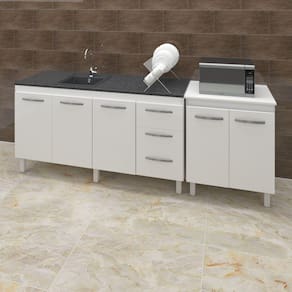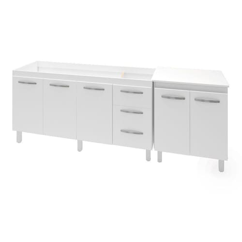 O Kit Balcão para pia de 150 cm Diana com Balcão Multiuso para Micro-ondas ou Forno Serena vai trazer para a sua casa praticidade, elegância e tornar a sua cozinha um ambiente ainda mais especial. Por serem móveis da mesma linha, eles combinam, deixam o ambiente harmônico, diferenciado e ainda mais atraente! A sua cozinha merece este lindo kit da Moblis Móveis, adquira já o seu! Características:Altura:83,5 cm (Com os Pés).Altura sem os pés: 67 cm.Largura: 148 cm (Padrão para pia de 150 cm).Profundidade: 50 cm.Material: MDP (madeira).Portas: 3 Portas.Gavetas: 3 Gavetas.Prateleiras: 1 Prateleira.Puxadores: 6 puxadores plásticos cromadosPés: 6 pés reguláveis de plástico.Altura dos pés:16,5 cmRegulagem dos pés: Somente para nivelamento, (Chega no máximo a 18 cm).Corrediças: Metálicas.Indicações de Uso: Cozinha*Imagem meramente ilustrativa, Não acompanha tampo ou pia nem objetos decorativos, é somente o balcão.Características Balcão multiuso micro-ondas Forno Elétrico Serena:Altura: 85 cm (Altura do produto com os pés e com o tampo)Altura sem os pés: 68,5 cmLargura: 70 cmProfundidade: 53 cm*A largura 70 cm e Profundidade 53 cm correspondem ao tampo do balcão, sem o tampo o balcão tem 68 cm de Largura e 50 cm de profundidade (mesma profundidade do balcão de pia).Material: MDP Portas: 2 PortasPrateleiras: 1 prateleira (Opcional)Puxadores: 2 puxadores plásticos cromadosPés: 4 pés reguláveis de plástico.Altura dos pés: 16,5 cmRegulagem dos pés: Somente para nivelamento, (Chega no máximo a 18 cm).Acompanha tampo: SimCaracterísticas do kit montado:Largura 218 cm (lado a lado os dois balcões).Profundidade 53 cm (Profundidade do balcão para cooktop com tampo, sem tampo os balcões possuem 50 cm de profundidade.)Altura: 85 cm (Altura do balcão para cooktop com tampo, sem tampo os balcões possuem 83,5 cm de altura.)*Os Móveis não são acoplados, são montados individualmente e podem ser utilizados em locais diferentes.*Imagem meramente ilustrativa, não acompanha objetos decorativos, é somente os dois balcões.