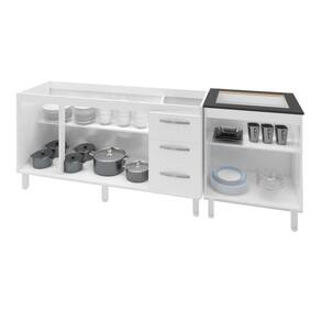 Armário Cozinha Gabinete Pia De 160 Cm Emily Com Balcão Cooktop 4 Bocas Branco Jade Hoje em dia não da para ficar perdendo tempo com móveis velhos ou que não atendam a nossa expectativa naquele ambiente em que passamos a maior parte do nosso tempo não é mesmo? A cozinha... É por isso que a Moblis Móveis traz para você, o Kit Balcão para pia de 160 cm Emily com Balcão para Cooktop 4 bocas Jade, para dar aquele toque especial na sua cozinha tornando os seus momentos mais agradáveis e descontraídos. Não fique ai esperando, adquira já o seu! Características do Balcão para pia de 160 cm Emily: Altura:83,5 cm (Com os Pés). Altura sem os pés: 67 cm. Largura: 157 cm. Profundidade: 50 cm. Material: MDP (madeira). Portas: 3 Portas. Gavetas: 3 Gavetas. Prateleiras: 1 Prateleira. Puxadores: 6 puxadores plásticos cromados Pés: 6 pés reguláveis de plástico. Altura dos pés:16,5 cm Regulagem dos pés: Somente para nivelamento, (Chega no máximo a 18 cm). Corrediças: Metálicas. Indicações de Uso: Cozinha