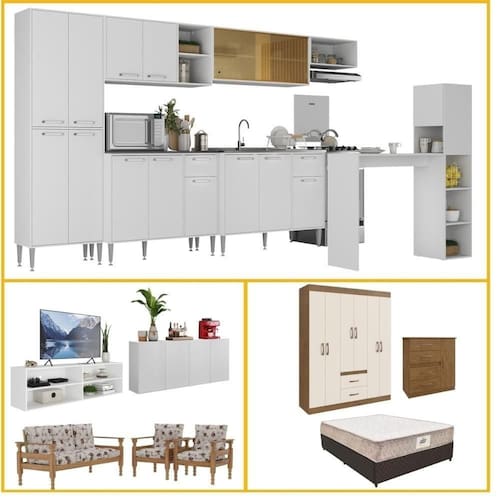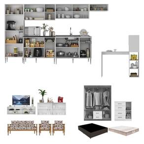 - Produto Composto por: 1 armário de cozinha com bancada, 1 rack, 1 aparador, 1 sofá 3 lugares, 2 poltronas, 1 guarda-roupas, 1 cômoda, 1 cama box com colchão, manual de montagem e kit ferragem.