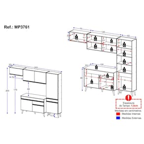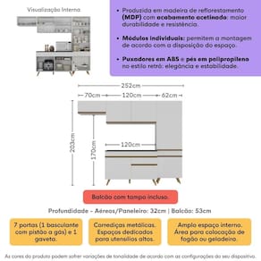Altura: 203cm | Largura: 252cm | Profundidade: 53cm (Balcão) - 32cm (Aéreos/Paneleiro)