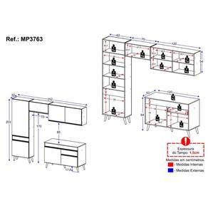 Altura: 203cm | Largura: 252cm | Profundidade: 53cm (Balcão) - 32cm (Aéreos/Paneleiro)