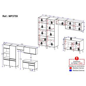 Altura: 203cm | Largura: 314cm | Profundidade: 53cm (Balcão/Paneleiros) - 32cm (Aéreos)