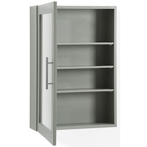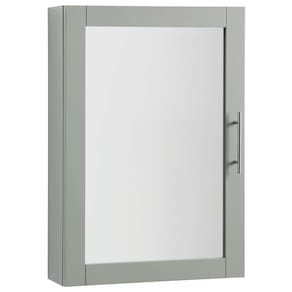 - Estilo tradicional: este armário de parede apresenta um acabamento cinza e ferragens de níquel escovado, complementado por uma porta espelhada.