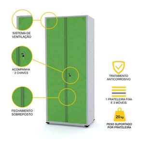 - Armário de aço com 2 portas, confeccionado em chapa de aço 26 (0,45 mm) e prateleiras em chapa de aço 24 (0,60 mm).