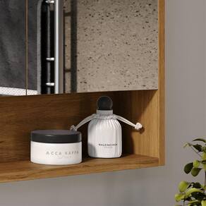 3 Portas com amortecedores Puxador no próprio móvel Dobradiças metálicas Nicho Aparente Espelho incluso Prateleira Interna