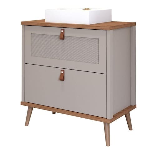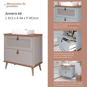 CARACTERÍSTICAS: - Gabinete para Banheiro com Cuba desenvolvido em MDF - Porta em MDF revestido com tela sintética de fácil limpeza e antimofo - Acabamento em pintura BP. - Cuba em mármore sintético. - Amplo espaço interno - Porta com pistão à gás - Puxadores de estilo retrô em couro sintético.