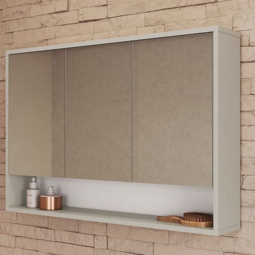 O(a) Armário de Banheiro Bari 3 Portas com Espelho Arenas - Art In Móveis é produzido em MDP na escala de brilho Fosco, e possui um grau de dificuldade de montagem: Médio.