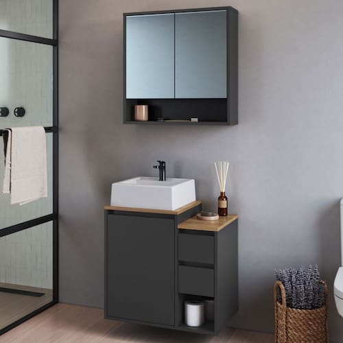 O(a) Armário de Banheiro Bologna 3 Portas 2 Gavetas com Cuba e Espelho Grafite - Art In Móveis é produzido em MDP na escala de brilho Fosco, e possui um grau de dificuldade de montagem: Médio.