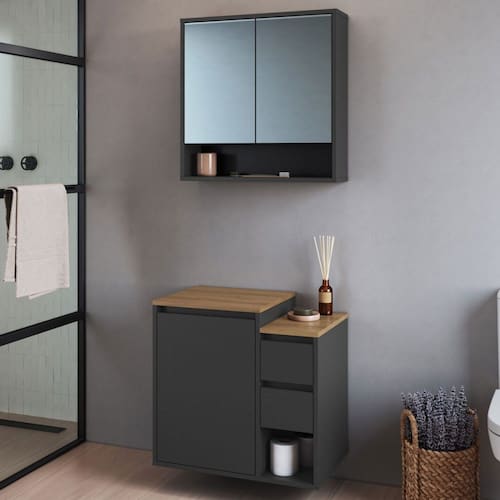 O(a) Armário de Banheiro Bologna 3 Portas 2 Gavetas com Espelho Grafite - Art In Móveis é produzido em MDP na escala de brilho Fosco, e possui um grau de dificuldade de montagem: Médio.