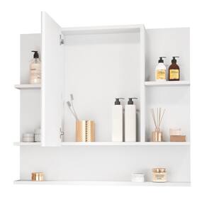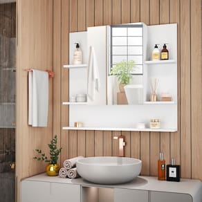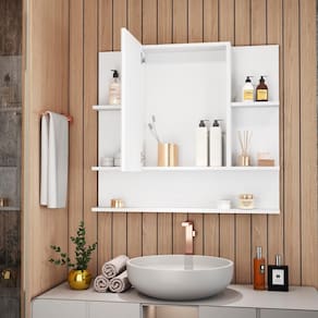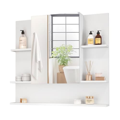 O modelo conta com porta articulada, ideal para manter seus itens mais utilizados protegidos, além de prateleiras abertas que facilitam o acesso a objetos do dia a dia, como sabonetes, escovas, cremes e aromatizadores. A distribuição inteligente dos compartimentos otimiza o espaço, proporcionando organização sem abrir mão do charme.