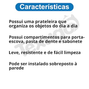 Possui compartimentos para porta-escova, pasta de dente e sabonete.