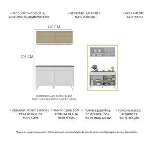 Dimensões do produto montado: Altura: 203cm | Largura: 120cm | Profundidade: 32cm (aéreos) - 53cm (balcão com tampo) *Você pode consultar as medidas internas na imagem técnica do produto.