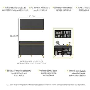 Dimensões do produto montado: Altura: 203cm | Largura: 120cm | Profundidade: 32cm (aéreos) - 53cm (balcão com tampo) *Você pode consultar as medidas internas na imagem técnica do produto.