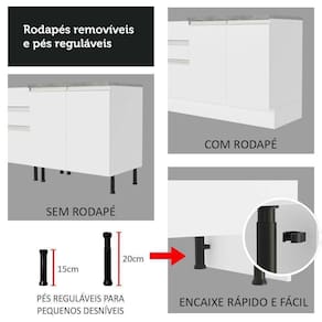 Este móvel possui puxadores em alumínio, amortecedores para fechamento suave das portas e corrediças telescópicas que permitem a abertura total das gavetas. Além disso, tem pés reguláveis em PVC e rodapé removível em MDP.