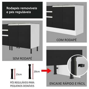 Para completar, o acabamento da estrutura é branco e o das portas e frentes é preto. Feito em Pintura Poliéster ecológica, que consiste na aplicação de 7 camadas de proteção, garantindo excelente proteção contra água e calor.