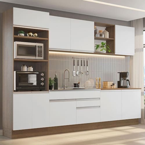O espaço interno e externo nos aéreos e balcões é ótimo para a organização de todos os utensílios, louças e decorações. A torre comporta forno e micro-ondas e o balcão de pia possibilita a colocação de pias de inox ou pedra. Ou seja, tem lugar pra tudo que você precisa!