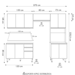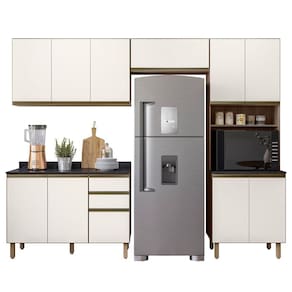 Com uma estrutura robusta em MDF de 15mm, este conjunto garante durabilidade e resistência. O acabamento em pintura UV confere um visual moderno e fácil de limpar, enquanto as dobradiças metálicas com amortecedores e os puxadores de alumínio proporcionam um fechamento suave e silencioso das portas. O Paneleiro Para Micro-Ondas, com quatro portas, oferece amplo espaço de armazenamento, além de nichos estrategicamente posicionados para eletrodomésticos e condimentos. O Armário Aéreo de 120cm, com três portas e uma prateleira interna, otimiza o espaço vertical, permitindo a organização eficiente da cozinha. O Balcão Para Pia de 120cm já com tampo, inclui duas portas e três gavetas com corrediças telescópicas, garantindo acesso fácil e organização dos utensílios. Os pés em PVC são ajustáveis, assegurando estabilidade em qualquer superfície. Por fim, o Armário Basculante aéreo de 80cm, com pistão a gás, reflete o cuidado na fabricação, promovendo um uso confortável e prolongando a vida útil do móvel. Este kit completo é a solução ideal para quem busca uma cozinha organizada, elegante e prática.