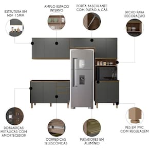 Com estrutura robusta em MDF de 15mm, garante durabilidade e resistência, enquanto o acabamento em pintura UV confere um visual moderno e fácil de limpar. As dobradiças metálicas com amortecedores e puxadores de alumínio proporcionam um fechamento suave e silencioso das portas. O Paneleiro Para Micro-Ondas, com quatro portas, oferece amplo espaço de armazenamento, além de nichos estrategicamente posicionados para eletrodomésticos e condimentos. O Armário Aéreo de 120cm, com três portas e uma prateleira interna, otimiza o espaço vertical, permitindo a organização eficiente da Cozinha. O Balcão Para Pia de 120cm, sem tampo, inclui duas portas e três gavetas com corrediças telescópicas, garantindo acesso fácil e organização dos utensílios. Os pés em PVC são ajustáveis, assegurando estabilidade em qualquer superfície. Por fim, o Armário Basculante aéreo de 80cm, com pistão a gás, reflete o cuidado na fabricação, promovendo um uso confortável e prolongando a vida útil do móvel.