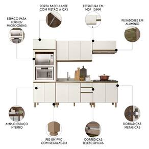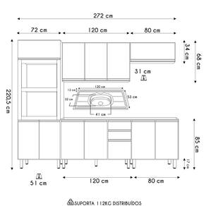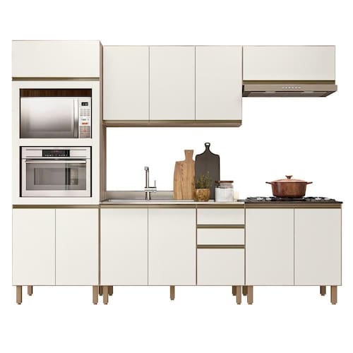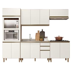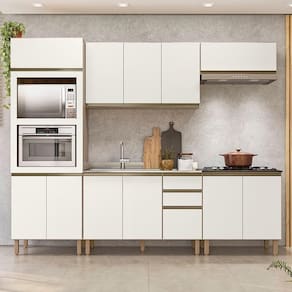 Conteúdo da Embalagem: 1 Balcão 120cm, 1 Balcão 80cm, 1 Armário Aéreo 120cm, 1 Armário Basculante, 1 Paneleiro, 1 Pia Inox 120cm.