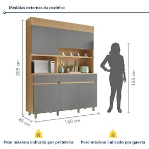 Armário de MDF é melhor do que MDP? Sim! O MDF oferece maior durabilidade, resistência e acabamento superior, com vida útil mais longa. Acabamento da Prateleira: Impressão Escala de Brilho da Prateleira: Semi-Brilho Acabamento da Gaveta: Impressão Escala de Brilho da Gaveta: Semi-Brilho Acabamento da Porta: Impressão Escala de Brilho da Porta: Semi-Brilho Acabamento dos Pés: Pintura Acompanha Tampo: Sim Altura dos Pés: 10 cm Altura Máxima dos Pés: 10.0000 Ambiente Principal: Cozinha Balcão Suporta Pia: Não codigo_ean: 7900288288523 Complexidade da Montagem: Alta: deve ser montado por um montador especializado Cor: Carvalho/Titânio Cor do Produto: Carvalho/Titânio Escala de Brilho: Semi-Brilho Gaveta com Chave: Não Itens Inclusos: 1 Cozinha Compacta, Kit Ferragens e Manual de Montagem Linha ou Coleção: Realeza Manual de Montagem e Instalação: https://product-hub-prd.madeiramadeira.com.br/367142085/documents/72841a77-83bc-491a-8d9a-892006fc338a333020073217637484323123.pdf Marca: Nesher Móveis Material da Corrediça: Metálica Material da Dobradiça/Corrediça da Porta: Metálica Material da Gaveta: MDF Material da Porta: MDF Material da Prateleira: MDF Material do Tampo: MDF Material dos Pés: ABS Medida de cada item (A x L x P): A 205cm X L 160cm X P 45cm modular: Não Necessita Montagem: Sim O Balcão Acompanha Pia: Não Origem do Produto: Nacional Pés Reguláveis: Sim Peso: 99,84 kg Peso Máximo por Gaveta: 5 kg Peso Máximo por Prateleira: 10 kg Possui Pés: 08 Possui Portas: Sim Possui Prateleiras: Sim Possui recorte para Cooktop: Não Possui Rodízio: Não Produto Montado: Sim Recomendações de Uso, Manutenção e Limpeza: Utilizar pano macio levemente umedecido e na sequencia pano macio seco. Sapatas Niveladoras: Sim Sistema de Montagem: Parafusos e Cavilhas Tamanho Indicado da Pia: Não Suporta Pia Tipo de Corrediça da Gaveta: Metálica Telescópica Tipo de Dobradiça da Porta: 35 mm Tipo de Puxador da Gaveta: Embutido Tipo de Puxador da Porta: Embutido Marca: Não Informado