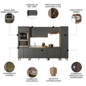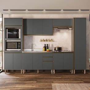 O Paneleiro Torre Quente Duplo, é um móvel funcional e moderno, projetado para oferecer praticidade e organização ao ambiente. Com duas portas inferiores e uma prateleira interna, oferece espaço adicional para armazenar e organizar. A porta superior basculante com pistão a gás facilita o acesso e integra eletrodomésticos como forno e micro-ondas ao móvel. O Armário de Cozinha Aéreo 120cm oferece três portas e uma prateleira interna para organizar itens de diferentes tamanhos. O Balcão Com Pia inox 120cm com cuba e válvula para auxiliar no dia a dia, possui duas portas e três gavetas espaçosas, incluindo um gavetão, com pés em PVC reguláveis que asseguram estabilidade mesmo em pisos irregulares. O Armário Aéreo Basculante 80cm, com pistão a gás, proporciona um movimento suave e silencioso ao abrir e fechar a porta, aumentando a durabilidade do armário. O Balcão Para Cooktop conta com duas portas, o tampo tem recorte para cooktop 4 bocas e marcação para 5 bocas. O Paneleiro de 50cm com uma porta única que facilita o acesso às três prateleiras internas, é uma peça chave para manter a organização e agregar valor estético à cozinha. Todos os móveis possuem estrutura em MDF de 15mm, acabamento em pintura UV, dobradiças metálicas com amortecedor para um fechamento suave e silencioso, e puxadores em alumínio.