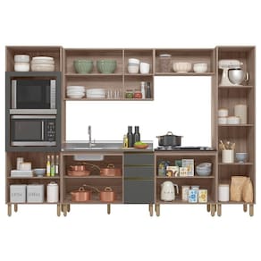 Conteúdo da Embalagem: 1 Balcão 120cm, 1 Balcão 80cm, 1 Armário Aéreo 120cm, 1 Armário Basculante, 1 Paneleiro Torre, 1 Paneleiro 50cm, 1 Pia Inox 120cm.