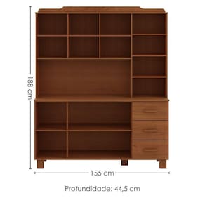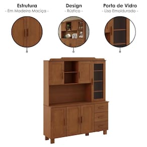Madeira Maciça Taeda e MDFArmário de Cozinha 1290C, versátil, funcional e rústico ideal para compor ambientes com personalidade! Conta com estrutura em Madeira Maciça Taeda de 12/14/16 mm (travessa frontal 16 mm, forros 2,8 mm) e acabamento em pintura brilho 10%. Composto por portas com detalhes emoldurados, dobradiças metálicas e puxadores em madeira maciça (portal lateral em vidro incolor liso de 3 mm). Acompanha também prateleiras em MDF 12 mm, gavetas com corrediças telescópicas, pés retos reforçados também em Madeira Maciça (40 mm), além de tampo amplo e espaçoso, ideal para acomodar eletrodomésticos em geral. Produto será entregue em 03 volumes.