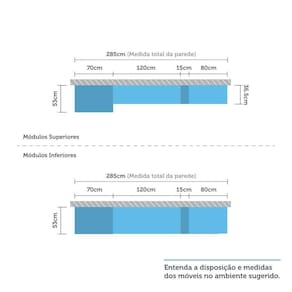 Uma cozinha modulada completa, para deixar seu ambiente super aconchegante e requintado. Composta por 7 peças cuidadosamente pensadas para sua organização. Os módulos são montados individualmente e permite a instalação da forma que melhor se adeque ao seu espaço. Contém dois nichos com espaço para forno micro-ondas e nicho garrafeiro. Para este ambiente utilizamos como proposta de parede Linear: 285cm