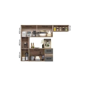 O Kit Cozinha Compacta Suspensa Juliete é uma ótima opção para quem não possui muito espaço e prefere organizar seus utensílios de cozinha de forma fácil e Prática! Ele possui cores modernas e cheias de estilo. O móvel é composto por 7 portas e 2 gavetas com corrediças metálicas, com estrutura reforçada em MDP.