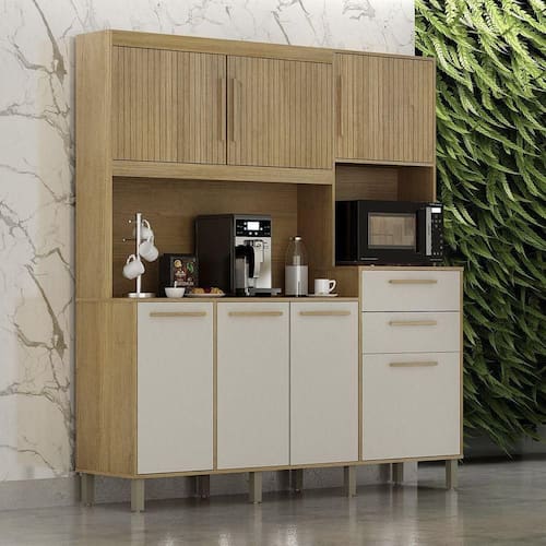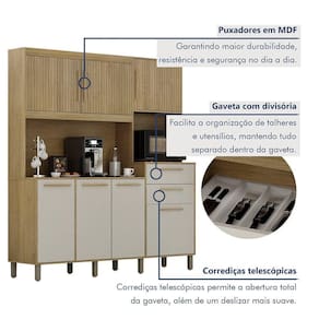 Renove sua cozinha com estilo e funcionalidade com nosso Armario de Cozinha! As portas superiores trazem detalhes frisados e puxadores em MDF que adicionam elegancia ao design, enquanto o nicho para micro-ondas otimiza o espaco e facilita o dia a dia. E para completar, as gavetas com corredicas telescopicas garantem um deslizamento suave e sem esforco, oferecendo praticidade na hora de organizar seus utensilios. Combinando elegancia e eficiencia, esse armario e perfeito para transformar sua cozinha em um ambiente moderno.