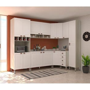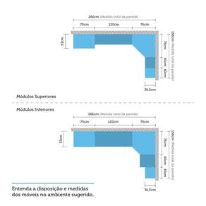 Uma cozinha modulada completa, para deixar seu ambiente super aconchegante e requintado. Composta por 8 peças cuidadosamente pensadas para sua organização. Os módulos são montados individualmente e permite a instalação da forma que melhor se adeque ao seu espaço. Contém um nicho com espaço para forno micro-ondas e nichos decorativos. Para este ambiente utilizamos como proposta de parede Lado da Pia: 266cm x 156cm