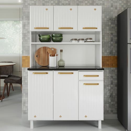 Este Armário Kit Cozinha, da linha Diamante, é uma escolha excelente para ampliar o espaço de armazenamento, organização e decoração na sua casa. Um móvel robusto e durável, fabricado inteiramente em aço, que passa por um processo de pintura eletrostática e anticorrosiva, com acabamento brilhoso – um tipo de tratamento recebido que reforça a durabilidade do seu móvel. Composto por 6 portas e um nicho, possui amplo espaço para armazenar seus mantimentos, utensílios, panelas e eletros de maneira bastante organizada. Conta ainda com 1 gaveta equipada com corrediças metálicas que deslizam com facilidade, além da estrutura interna ser polipropileno, um plástico muito rígido, resistente e fácil de lavar. O tampo deste Armário Kit é robusto, desenvolvido em MDP, sendo bastante resistente. Além dessa qualidade já reconhecida, o visual moderno e cheio de personalidade também destaque aqui: as delicadas linhas verticais das portas – inspiradas na tendência atual da decoração - em combinação com o aplique em alto relevo do “diamante” e o belo puxador em tom dourado, fazem o ambiente brilhar! A linha Diamante é sinônimo de durabilidade, beleza e praticidade para a sua cozinha!