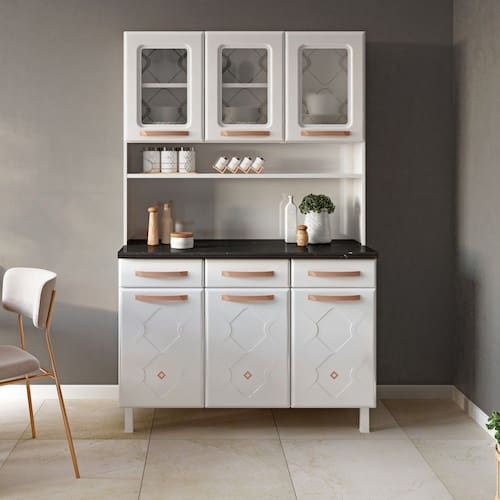 O Kit triplo da Linha Mirage New é um sonho de consumo para quem deseja trazer mais charme e funcionalidade ao ambiente. Em um único produto, o kit reúne balcão com três gavetas e armário, com espaço disponível de sobra para armazenar utensílios, louças e alimentos de maneira organizada. A modulação possui 03 vidros que, além de serem temperados garantindo total segurança, ainda são serigrafados com design harmônico. Os puxadores e apliques resinados na "cor" Cobre Fosco agregam beleza e sofisticação. As gavetas possuem corrediças metálicas, que deslizam suavemente na hora de abrir e fechar. A parte interna da gaveta é fabricada em plástico, material muito resistente e durável, que suporta até 5kg de peso. Fabricada em aço, recebe pintura eletrostática e anticorrosiva, com acabamento brilhoso. O tratamento recebido na pintura garante resistência e durabilidade ao móvel. Você merece ter esse charme de cozinha em sua casa!