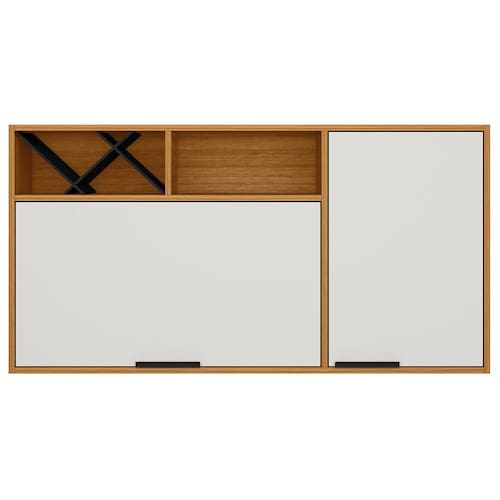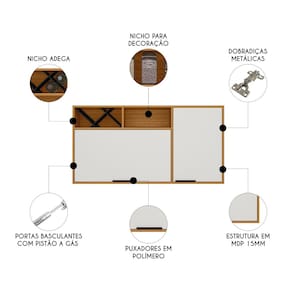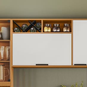 O Armário Aéreo conta com duas portas, uma basculante com pistão a gás, que proporciona uma abertura suave e controlada, e outra convencional com dobradiças metálicas reforçadas. Os puxadores em polímero são um charme à parte, adicionando um toque sofisticado que se adapta a diversos estilos de decoração. Para completar a composição, o modelo inclui um nicho decorativo e um nicho adega, perfeitos para expor objetos pessoais e acomodar seus rótulos favoritos com praticidade e elegância.