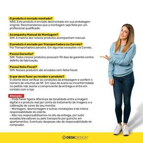 Limpeza e cuidados: Utilizar pano levemente umedecido com água, seguido de pano seco. Não utilizar produtos químicos ou abrasivos na limpeza. Evitar contato com objetos cortantes. Manter ao abrigo de local interno, sem ficar exposto diretamente ao sol, calor e umidade excessivo.