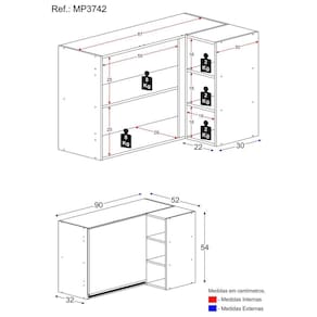 Dimensões do produto montado: Altura: 54cm | Largura: 90cm | Profundidade: 32cm *Você pode consultar as medidas internas na imagem técnica do produto.