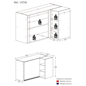 Dimensões do produto montado: Altura: 54cm | Largura: 90cm | Profundidade: 32cm *Você pode consultar as medidas internas na imagem técnica do produto.
