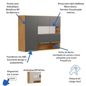 Informações do produto: Modelo: Nápoli Prime Tipo: Armário Aéreo Triplo Material: Estrutura em MDF, sendo composto por 2 portas e com acabamento em pintura UV. Altura: 90 cm Largura: 120 cm Profundidade: 30 cm Número de portas: 3 Portas Material da dobradiça: Metal Material da estrutura: MDF Material do fundo: MDF Material do puxador: ABS Necessita fixação na parede: Sim Possui chaves: Não Possui espelho/vidro: Sim Possui Fruteira: Não Tipo de Porta: Com dobradiças metálicas Espessura do Vidro Reflecta (mm): 3 Espessura do fundo (mm): 3 Espessura do material da estrutura (mm): 12 Número de nichos: 1
