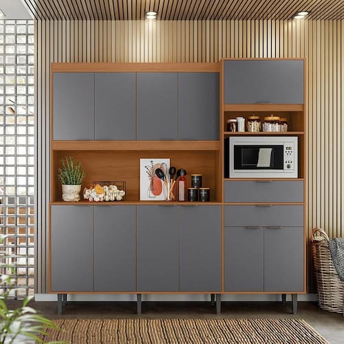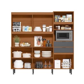 Espaço de Armazenamento InteligenteUm dos grandes diferenciais do Armário Bahamas 2.0 é o seu amplo espaço de armazenamento. Com diversas portas, prateleiras e nichos, você poderá organizar seus utensílios e louças de maneira prática e acessível. Além disso, o armário conta com um espaço dedicado para micro-ondas, otimizando ainda mais a funcionalidade do seu ambiente.