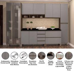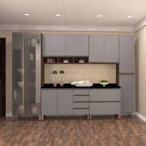 Armário De Cozinha Completa Com 6 Peças E Tampo Jade Luciane Móveis Nogueira Dourado Com Cinza Puro E Preto